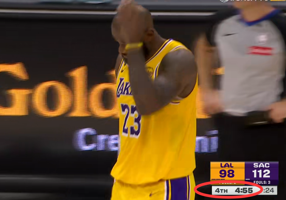 詹姆斯最后五分钟被换上场,他替换下去的是范德比尔特,而当时本来双方的分差是12分,本来湖人还有机会,结果詹姆斯上来之后一己之力送掉了比赛。首先詹皇上场之后一分没拿,也没有任何的正面数据贡献,甚至连一个助攻都没有送出来,那他上来之后到底干了些什么呢?他用一攻一防直接坑死了洛杉矶湖人。