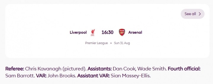 08月31日讯 英超官方宣布,今天利物浦vs阿森纳的裁判组调整,原VAR裁判萨里斯布里被更换为约翰-布鲁克斯。