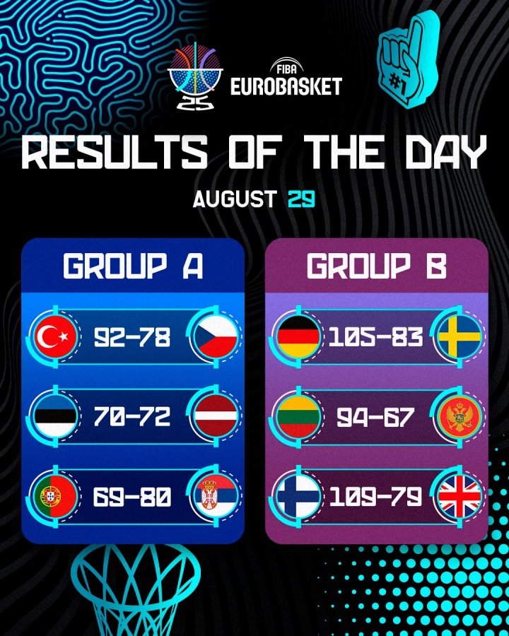 8月30日男篮欧锦赛完成第三日全部六场对决,赛果汇总如下: